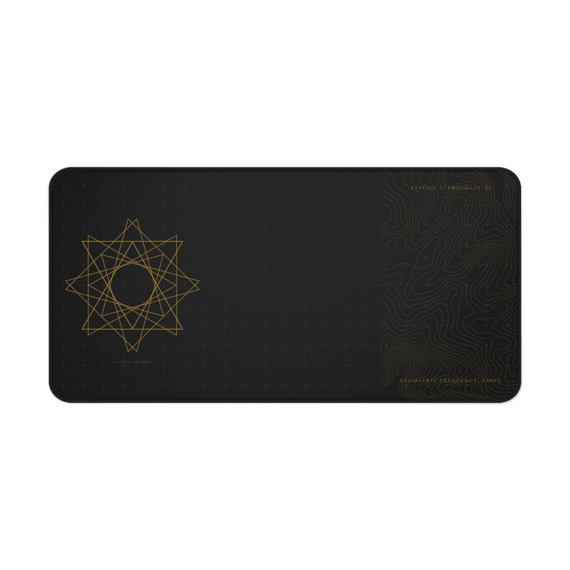 THE ARCHITECTURE The foundational layer of the Digital Sanctuary. A high-fidelity workspace surface featuring the "Vestige Protocol" topographic map and the "Sacred Anchor" geometric frequency.